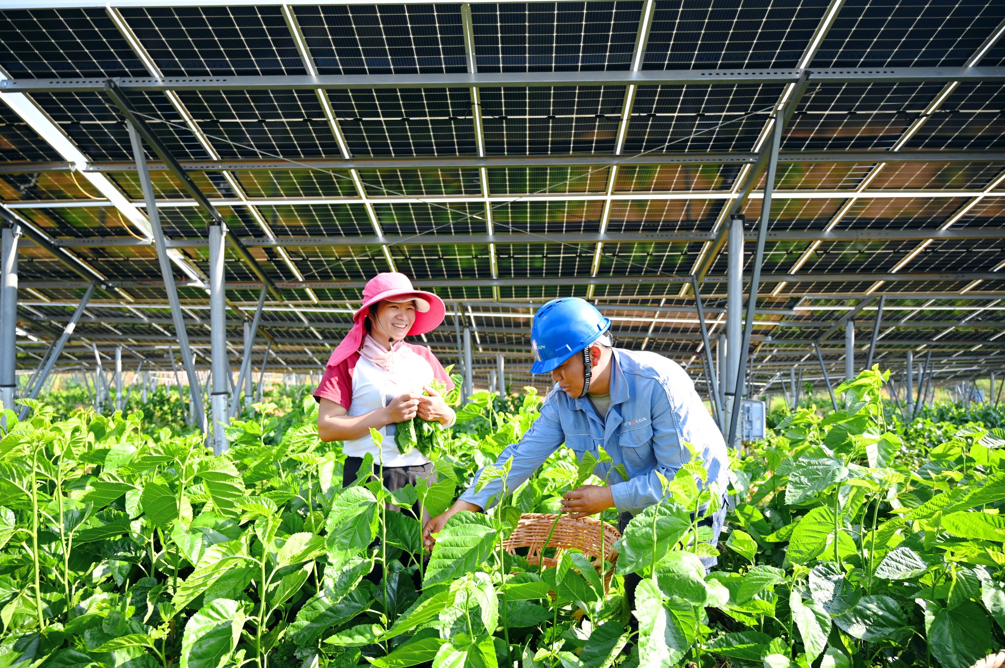 光伏电站工作人员帮助蚕农采摘桑叶。