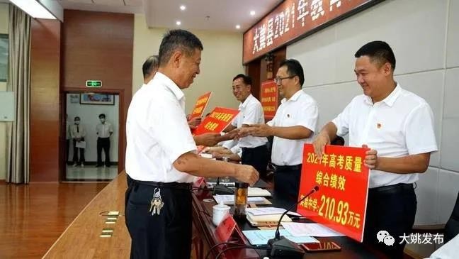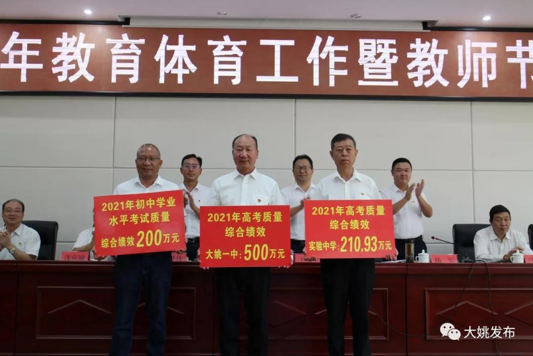 会上,县委、县政府为大姚一中、实验中学和县教育体育局颁发了高考、中考综合质量绩效奖共计910.93万元。