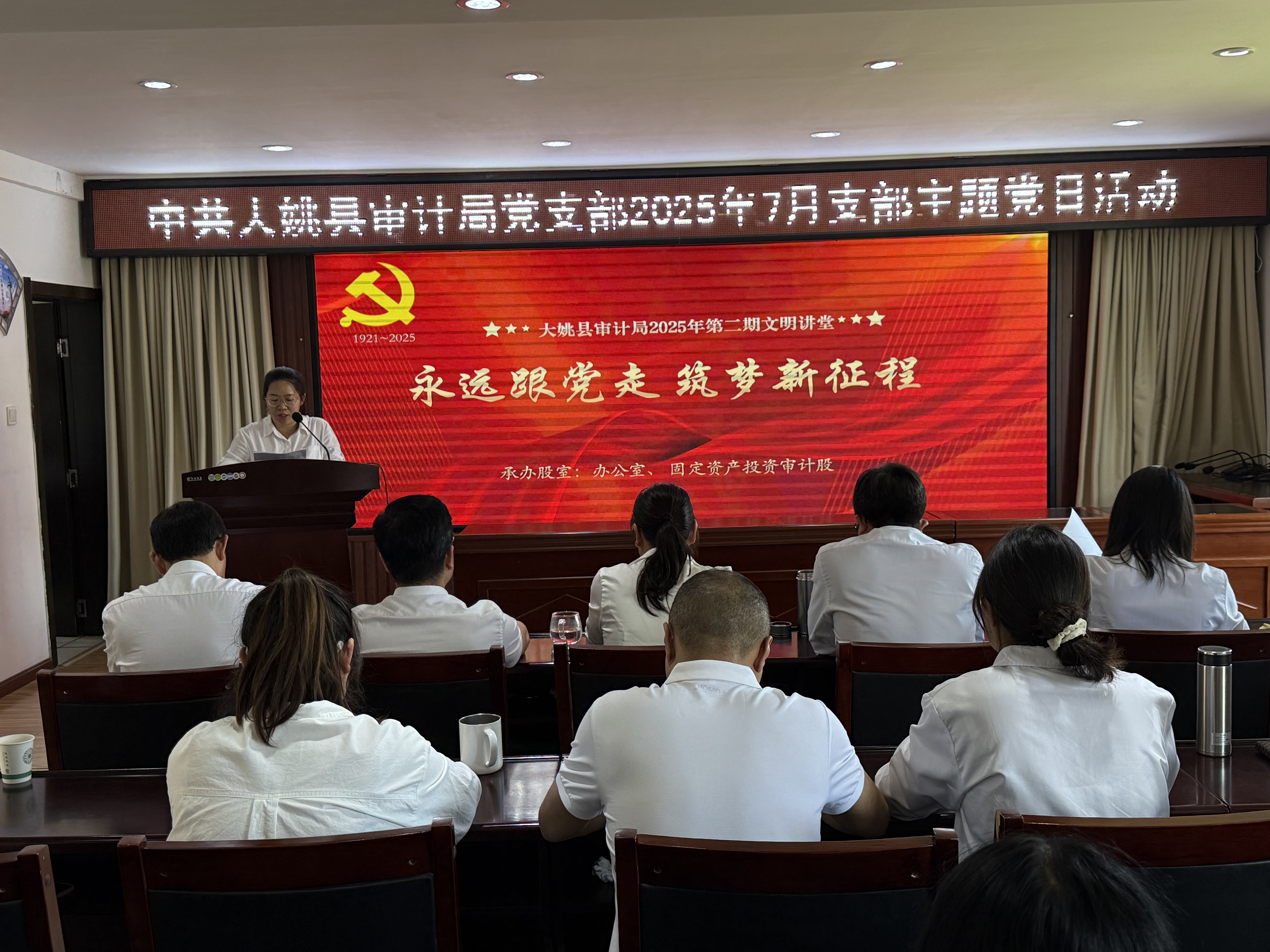 为庆祝中国共产党成立104周年,传承红色基因,凝聚奋进力量。近日,大姚县审计局举办2025年第二期文明讲堂活动,全体干部职工齐聚一堂,以“永远跟党走,筑梦新征程”为主题,开展了一场富有意义的精神洗礼。