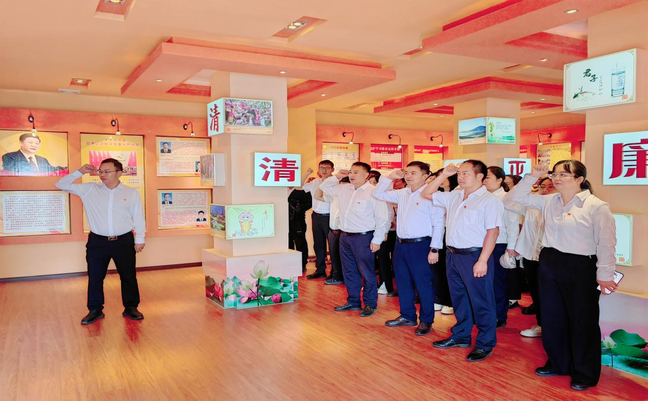 全体党员干部在讲解员引导下有序参观主题展厅。警示厅展示的一张张反面典型案例发人深省:他们有的身居高官,曾经是人民心目中的好领导,有的在基层,是老百姓眼中的贴心人,然而在市场经济大潮下,在金钱、权色、名利的诱惑下,放弃了对世界观的改造,放松了对自身的要求,出现了“只讲实惠,不讲理想;只讲索取,不讲奉献;只讲金钱,不讲原则”等腐败问题。走进阳光厅,心情豁然开朗,呈现在眼帘的是一张张榜样的照片,有“共和国勋章”的获得者,我国呼吸科专家钟南山。有“扶贫先进个人”获得者黄文秀和耿荣贵。“七一勋章”的获得者,有“大山女孩妈妈”之称的张桂梅。这些案例就是一面明镜,时刻提醒我们严守纪律底线。参观结束后,全体党员在宣誓墙前庄严重温廉政誓词,以坚定有力的誓言表达忠诚于党的决心。