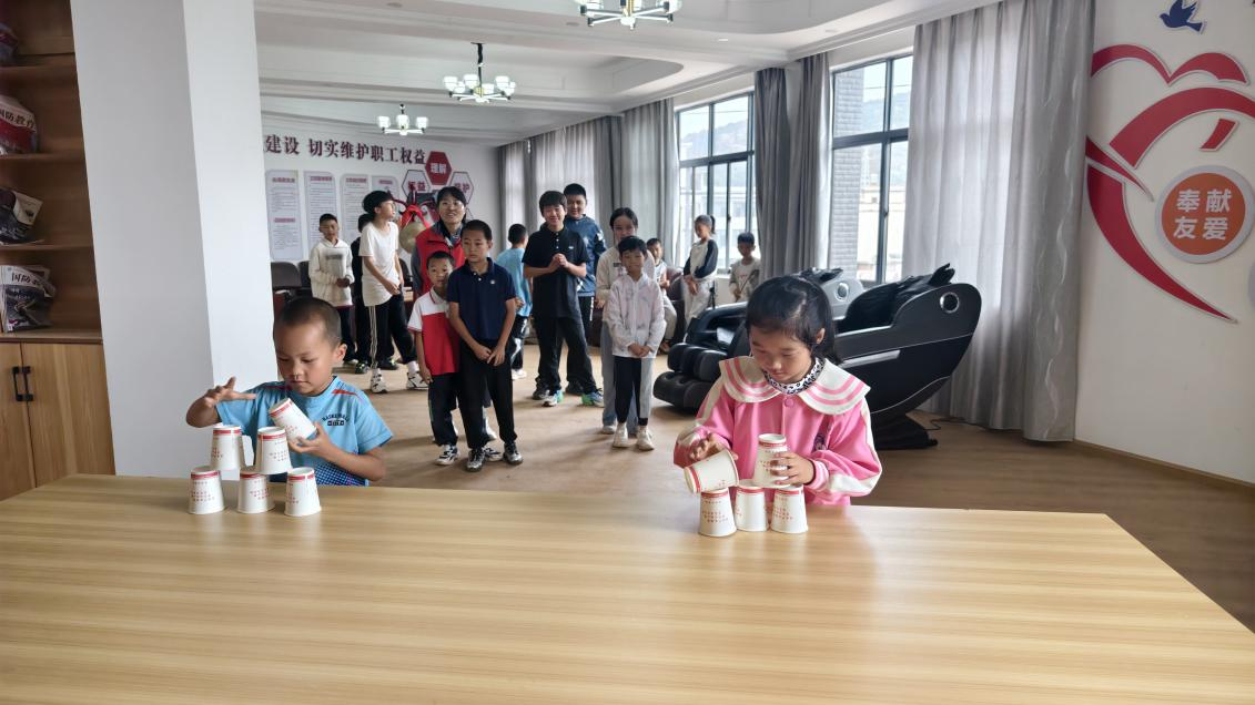简单的游戏组织了一轮又一轮,孩子们的笑声如同欢快的音符,在空气中不断回荡。他们互相打趣,你一言我一语:“你叠杯子的速度没我快,我才是叠叠乐小能手!”“你吹纸条的力气没我大,看我的厉害!”这不服输的语气里,满是童趣,仿佛在宣告着他们永不言败的精神。在这小小的桌游世界里,孩子们收获了快乐,也学会了竞争与合作。