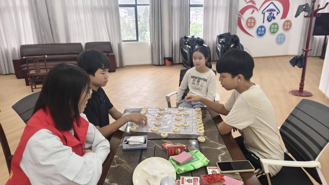 不管是象棋、五子棋、跳棋的二人对战,还是杯子叠叠乐、吹纸条、夹玻璃珠等分组对战游戏,孩子们都表现出了极高的兴趣。比赛结束时,他们那不服输的劲儿全冒了出来,有的孩子向志愿者们嘟囔吵嚷着:“我都没吹就比完了,我要再吹一次!”“我还想夹玻璃珠,我还没玩够呢!”