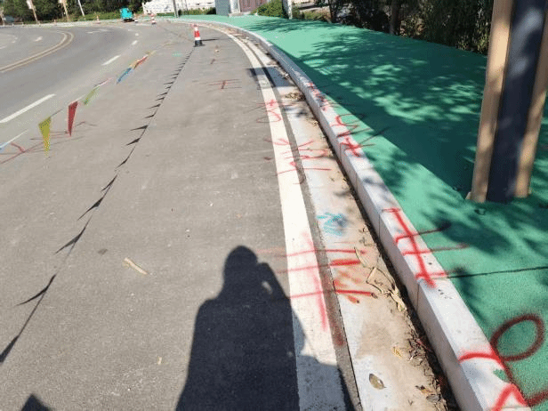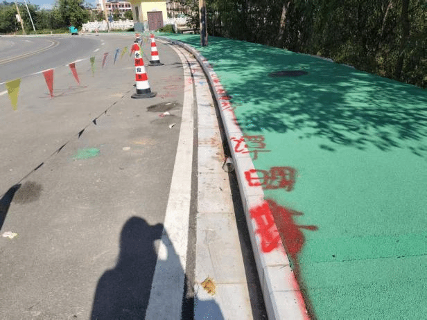 西河南路上段作为我县近期修缮完成的重要交通干道,本应以宽阔平整的路面展现城市形象。然而,部分流动摊贩为抢占“黄金摊位”,竟使用油漆、喷罐等工具,在崭新的绿道、路缘石、流水石及机动车道路面上,肆意涂画姓氏、电话号码、经营品类等标识。这些颜色杂乱、密集分布的涂鸦,不仅严重污染视觉环境,也对公共财物造成实质性损坏,与文明城市应有的整洁有序格格不入,引发周边居民和过往车主的强烈不满。