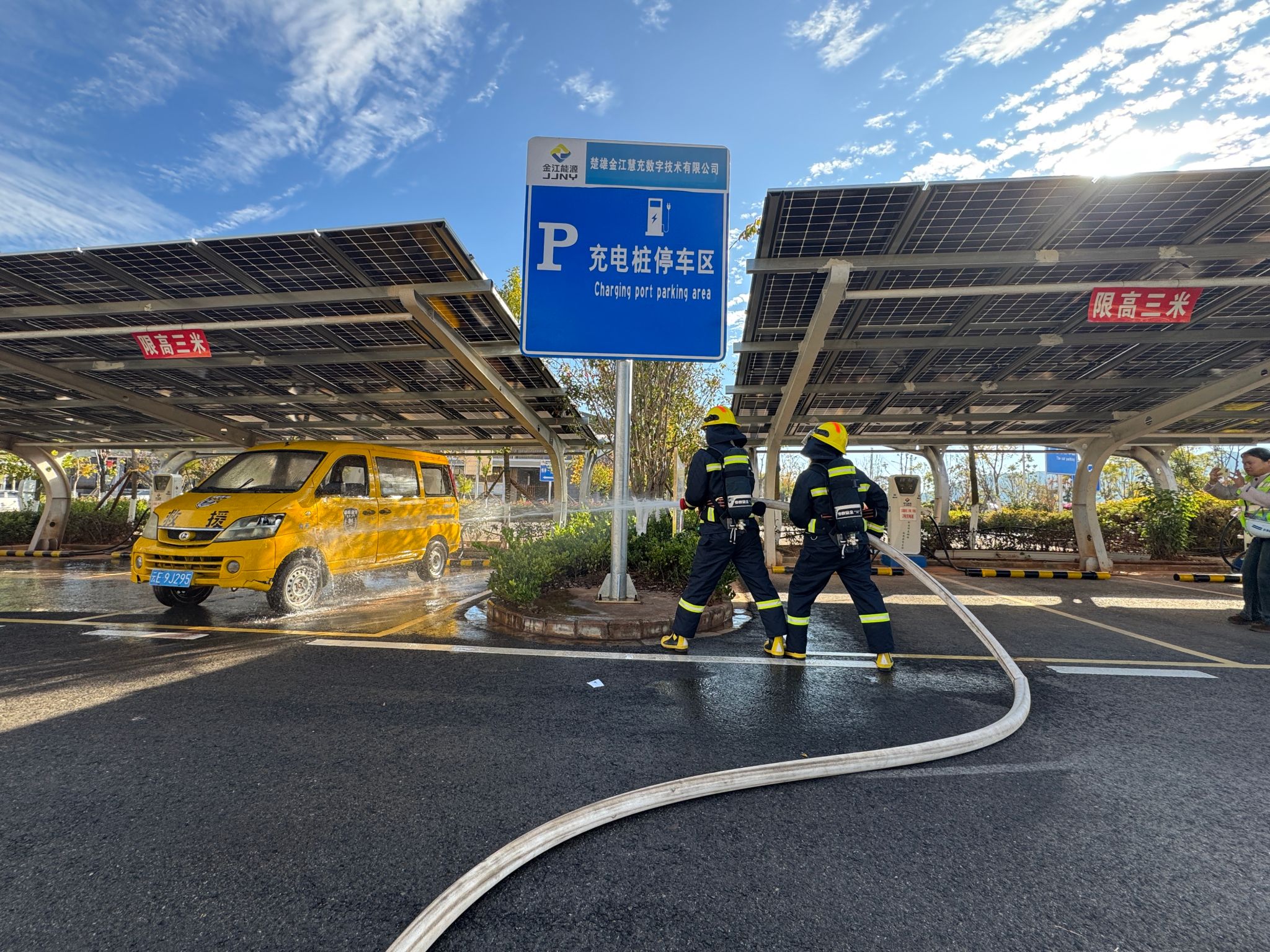 此次演练由大队消防指战员全程统筹指导,多部门协同参演,以“实战实训、政企联动”模式完成全流程应急处置演练。演练紧密结合冬季充电桩用电负荷攀升、线路故障风险激增的实际,设定“服务区充电桩在车辆充电过程中,因线路过载突发冒烟起火,浓烟快速扩散至周边充电区域”的实战场景,重点聚焦政企联动响应、多部门协同处置、处置流程闭环管控三大核心目标。演练启动后,在大队指战员的现场调度指挥下,各环节高效联动推进。