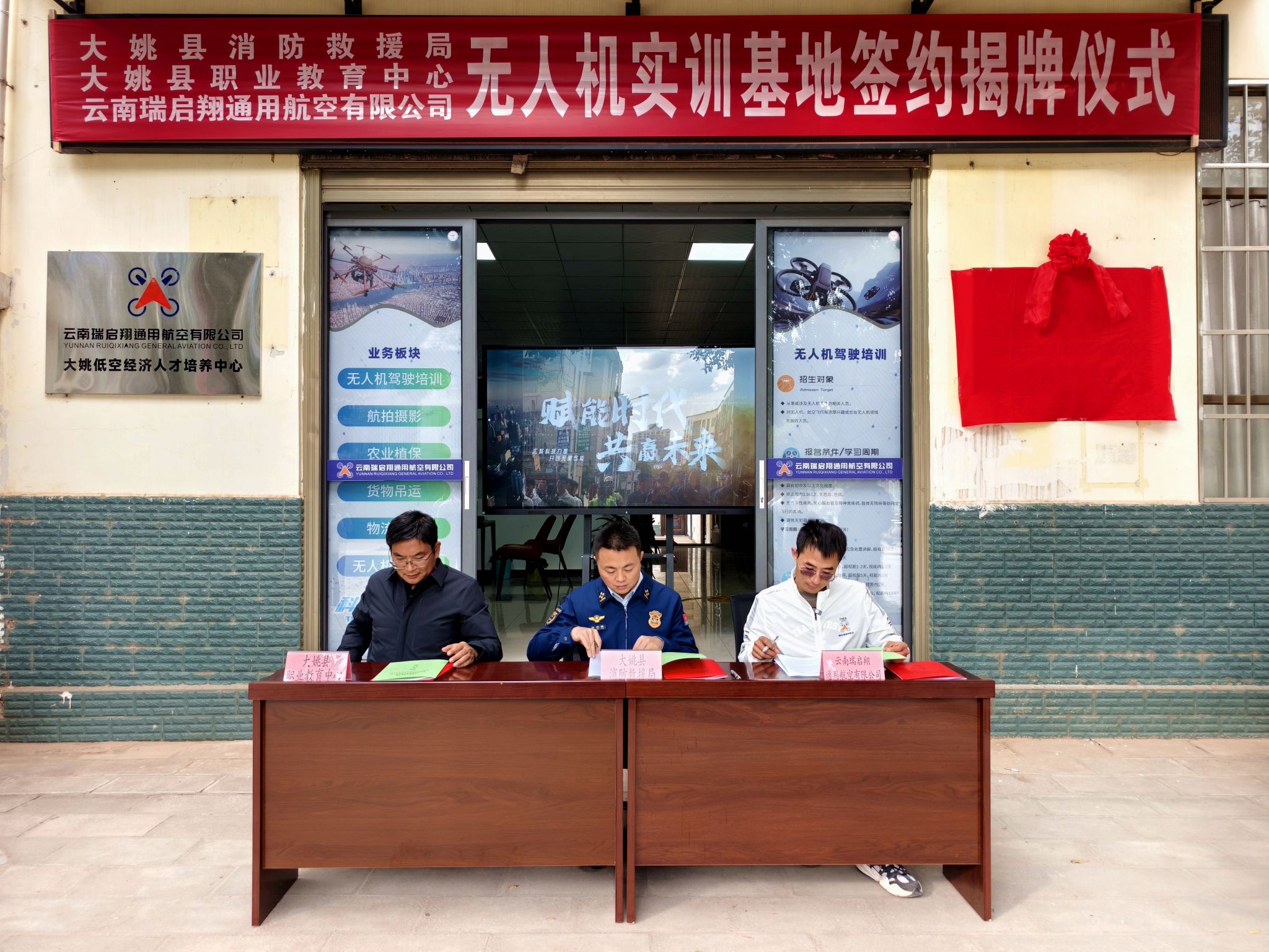近日,大姚县消防救援局、大姚县职业教育中心与云南瑞启翔通用航空有限公司“消校企”三方正式签约,同步启用标准化无人机实训基地。通过创新应急人才培养“政产学研用”融合模式,构建“实战牵引技术、技术反哺实战”的良性循环新格局,为县域消防救援能力现代化注入强劲科技动能。