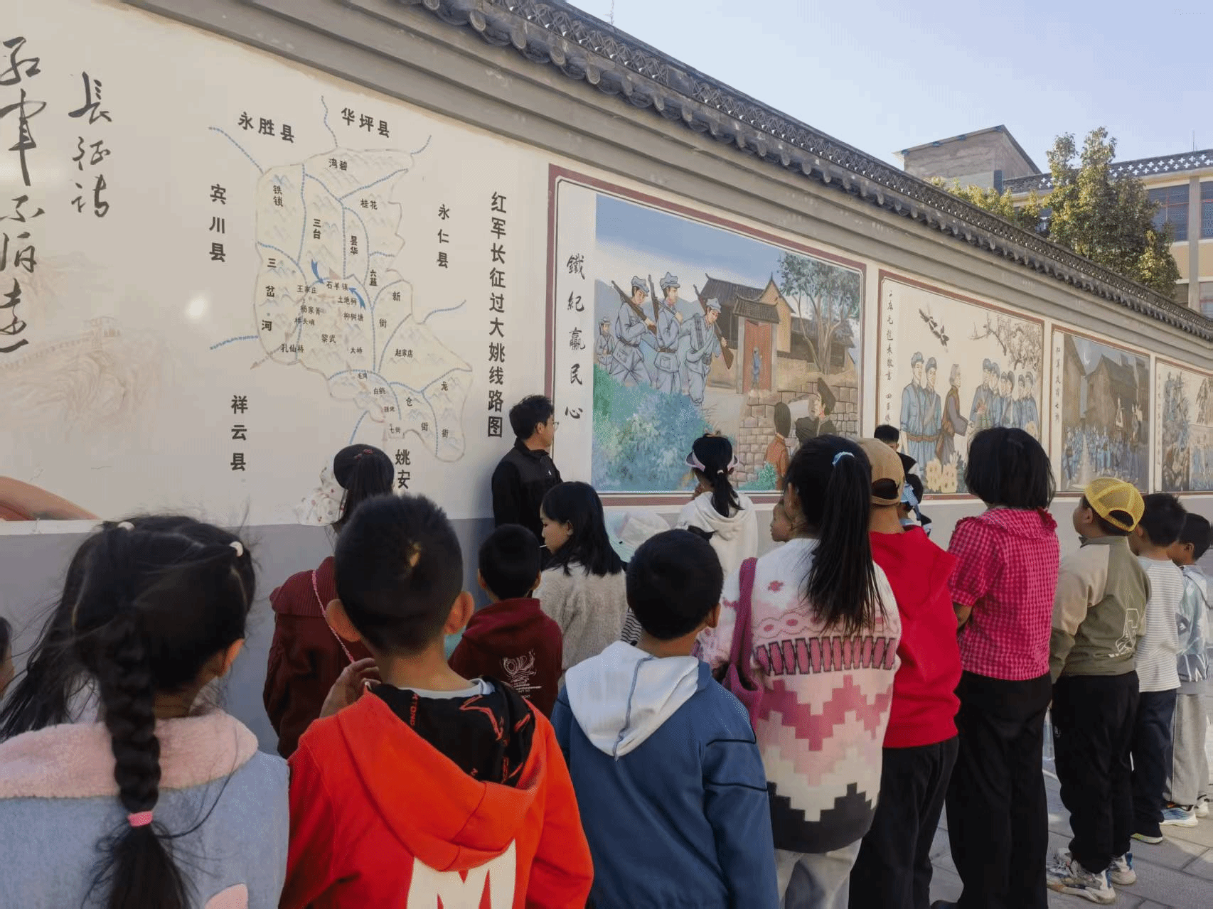 在记录红军长征过大姚的壁画前,孩子们纷纷驻足凝望,重温红六军团长征过大姚时不畏牺牲、坚韧不拔、团结奋进的伟大长征精神。这场跨越时空的精神对话,让孩子们真切感受到红色精神的温度。那些蕴含着家国大义、革命气节的红色精神,不再是遥远的文字记载,而是化作可感可知的精神力量,在孩子们的心田里深深扎根,催生出愈发茁壮的红色萌芽。