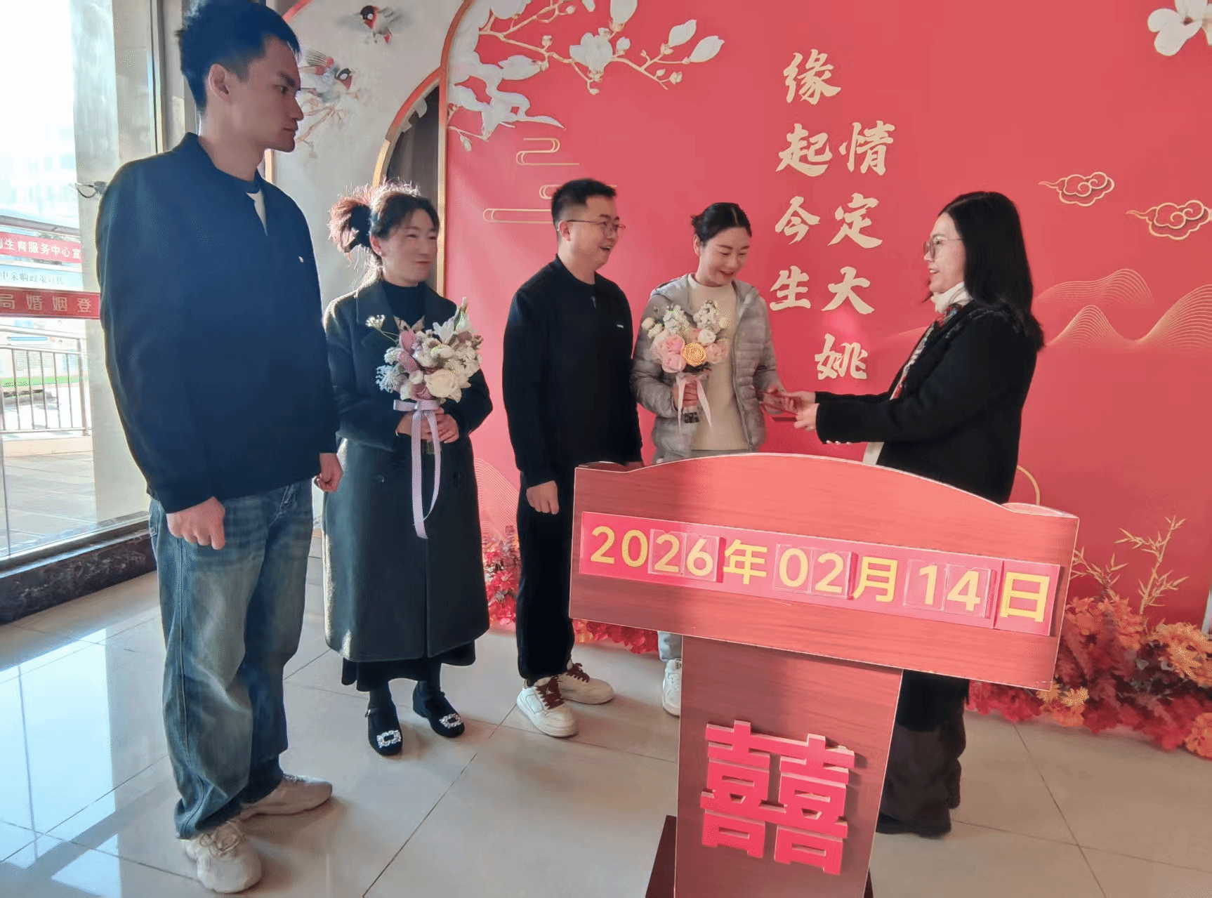 2月14日,婚姻登记处已顺利为64对新人办理了结婚登记手续。现场秩序井然、氛围温馨,工作人员全程耐心引导、细心审核、热心服务,从信息录入、材料审核到证件打印、颁证宣誓,每一个环节都高效顺畅,让新人们在最短时间内完成登记,收获满满的幸福与感动。