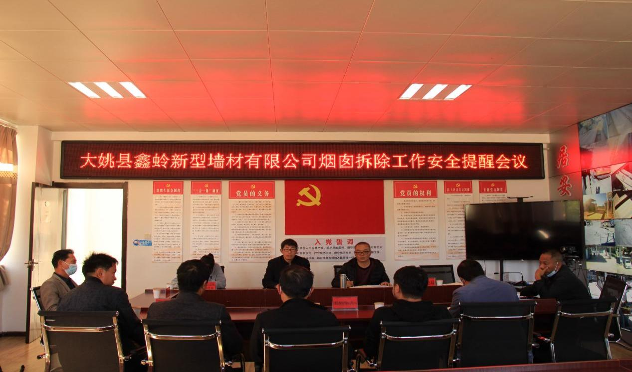 为推进大姚县鑫蛉新型墙材有限公司烟囱拆除工作,近日,大姚县安全生产委员会召开大姚县鑫蛉新型墙材有限公司烟囱拆除工作安全提醒会。会议由大姚县安全生产委员会办公室主任,县应急管理局局长杨仓生同志主持,县应急管理局分管领导和有关工作人员,金碧镇、自然资源局、住房城乡建设局有关领导,施工单位(江苏华电高空工程有限公司)和大姚县鑫蛉新型墙材有限公司有关负责人出席会议。