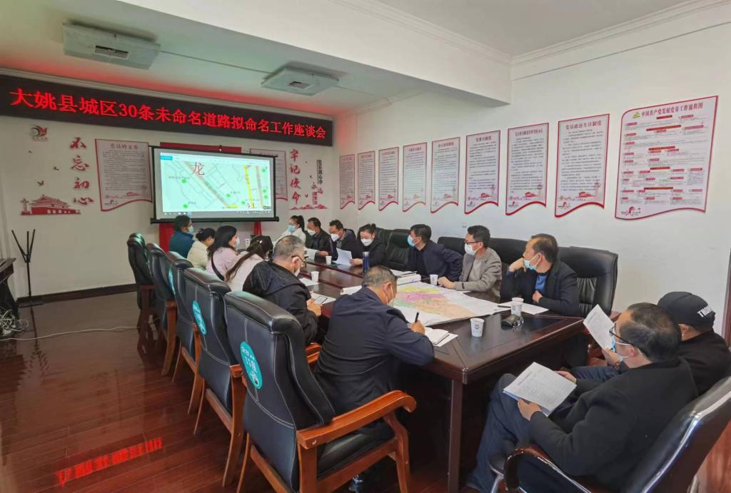 会上大姚县民政局党组书记、局长张如喜同志对拟命名工作进行了说明,地名区划工作人员对大姚县城区30条未命名道路拟命名方案进行演示并具体讲解,重点就新命名、拟更名内容及理由向与会人作了介绍。与会人员本着“通俗易懂、简洁明了、突出文化元素、彰显地域特色”的道路命名原则,结合道路命名规则,对大姚县城区内30条未命名道路进行了拟命名。