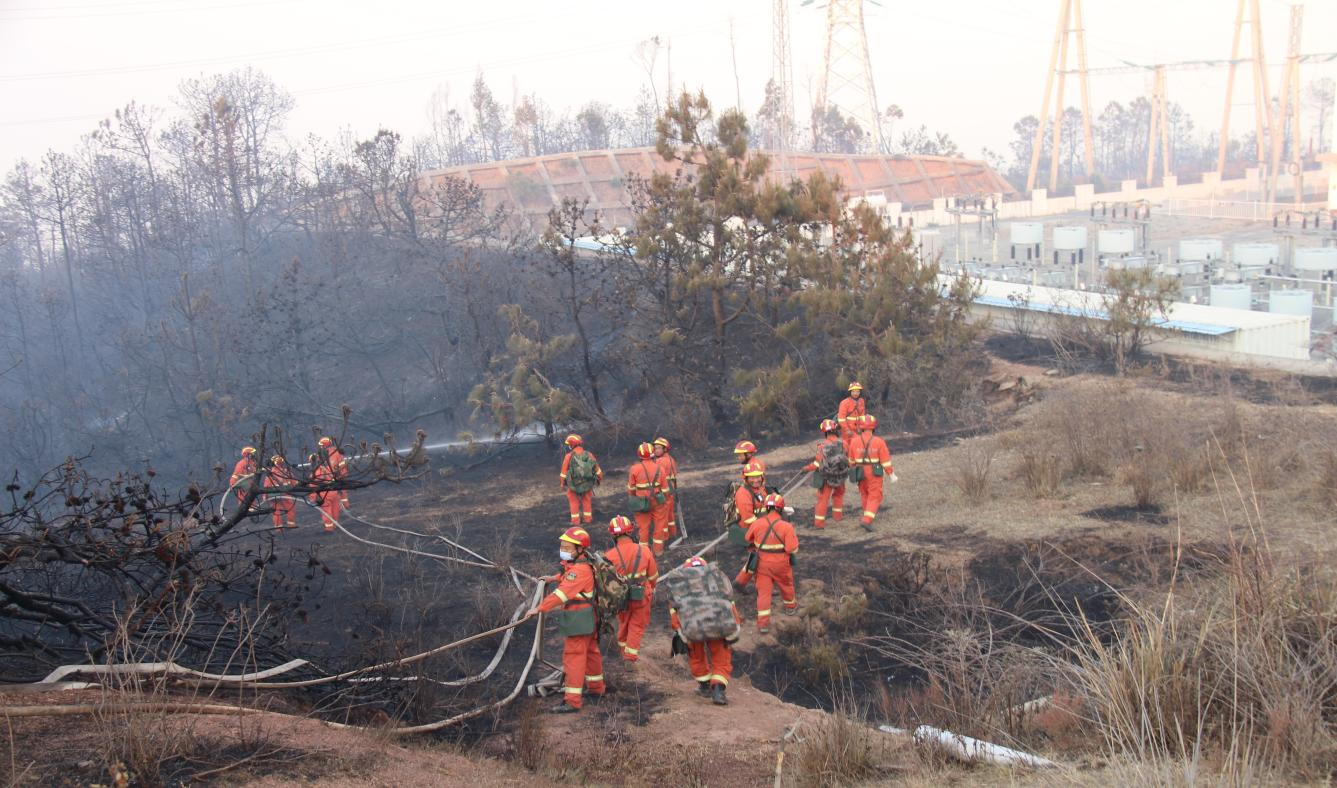 面对严峻形势,大队前指指挥员根据现场情况立即调整任务部署开展灭火战斗,采用“以水灭火”的战法,利用山地水窖及发电厂消防水池,布设2台动力水泵,架设灭火水路3000多米,在羊肝村与三峡姚安发电场一侧采取隔打结合、打湿山体阻火的方案构建起第一道安全“防护墙”,截止20时,火势得到了强有力的压制,进入余火清理阶段,确保了周围村组和三峡姚安发电场的绝对安全。