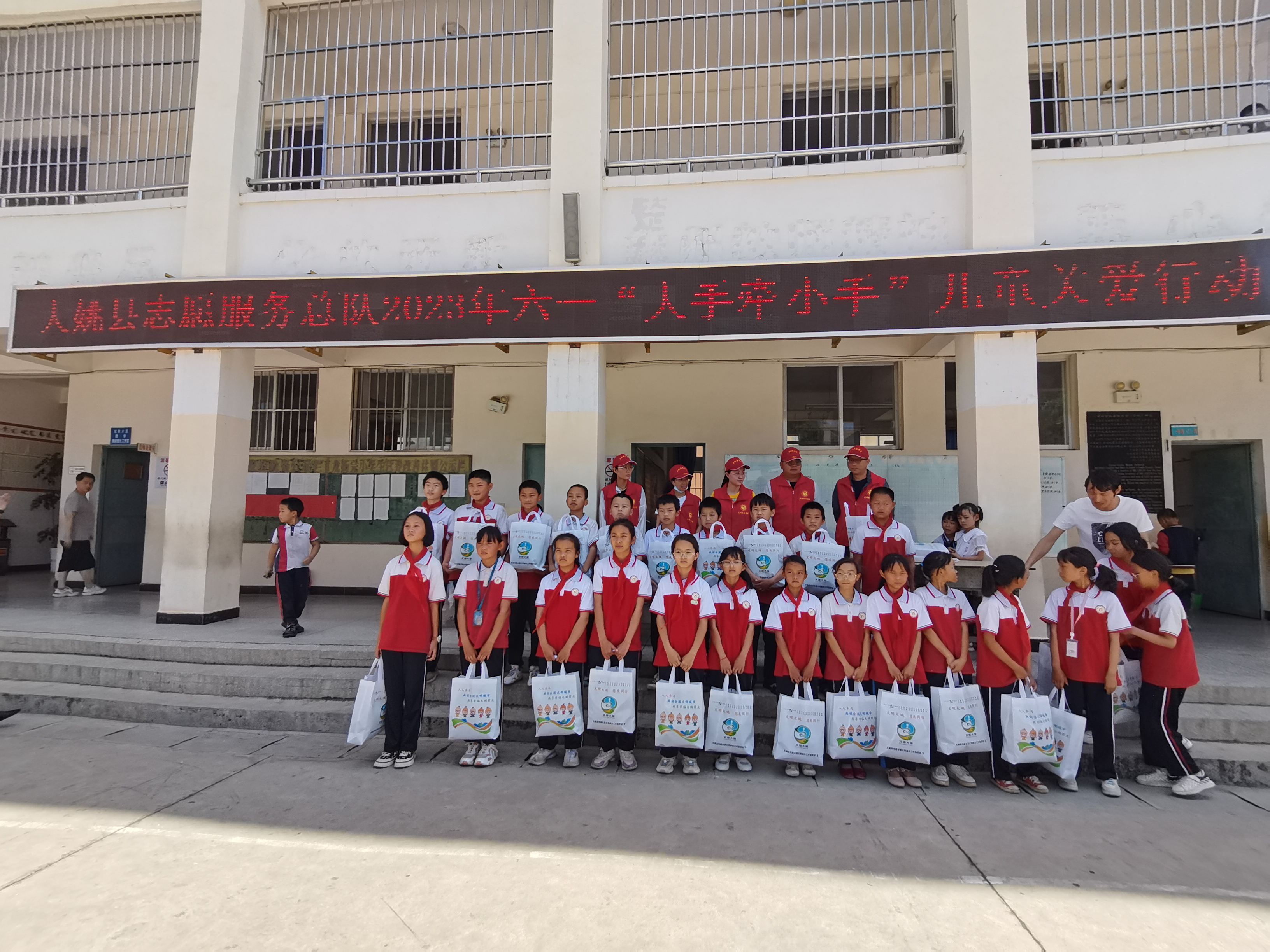 2023年5月29日,县民政局组建志愿服务队深入龙街镇中心完小开展2023年“情暖六一 大手牵小手”儿童关爱服务活动。
