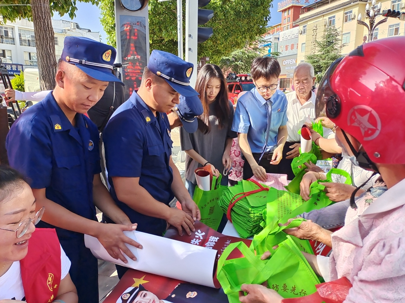 “阿姨,您看下我们的消防宣传手册,里面有针对家庭、学校、社区的防火灭火知识,回家可以给讲解一些火灾防范常识……”“大姐,请您了解一下这些消防安全常识,教育小孩不要玩火,大人在用火、用电、用气时一定要注意安全,一定要把危险物品放到小朋友不能触及的地方……”“大爷,你知道火警电话是多少吗?”