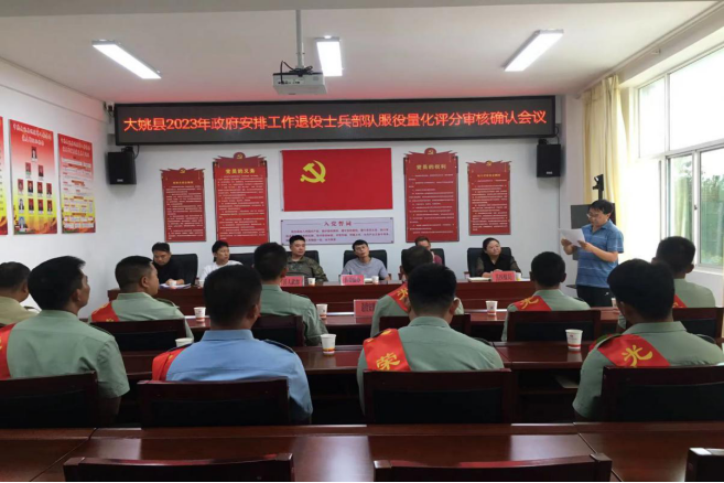 为做好2023年移交安置工作,确保高质量完成年度退役士兵安置任务,7月10日下午,大姚县人民政府复员退伍军安置办公室牵头组织召开2023年符合政府安排工作退役士兵返乡欢迎仪式暨部队服役量化评分审核确认会议。县人武部、县委编办、县人社局、县公安局、县医保局分管领导和11名政府安排工作退役士兵参加会议。