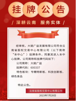 我县按照“储备一批、培育一批、辅导一批、上市一批”的工作路径,坚持“企业主动、政府推动、市场拉动、中介联动”的工作方式,通过建立现代企业管理制度,从不同板块培育和推动企业上市,打造出具有我县特色、品质优良、竞争力强的资本市场。2022年我县云南大姚祥华工业制造股份公司实现了在云南省股权交易中心挂牌零突破,2023年再添佳绩,新增楚雄云品鲜进出口贸易有限公司、大姚广益发展有限公司、大姚华盛饮料食品有限责任公司3户企业在云南省股权交易中心挂牌。