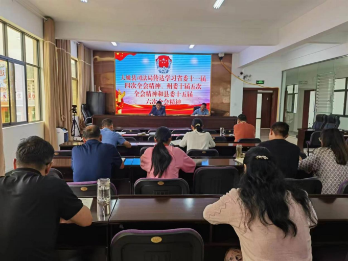 根据《中共大姚县委办公室关于迅速传达学习贯彻省委十一届四次全会精神、州委十届五次全会精神和县委十五届六次全会精神的通知》的相关要求,县司法局于8月7日上午,及时对以上会议精神组织专题学习。局党组书记杨新明同志亲自领学,局机关全体干部职工21人在司法局四楼会议室参会,各司法所干警14人以视频会议形式在分会场参会。