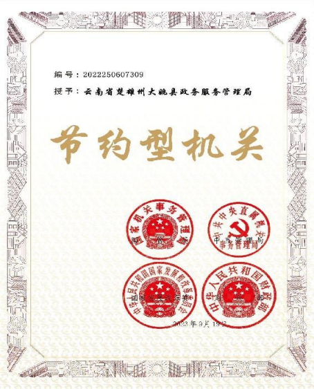 近日,全国“节约型机关”评选结果公布,大姚县政务服务管理局被国家机关事务管理局、中共中央直属机关事务管理局、中华人民共和国国家发展和改革委员会、中华人民共和国财政部授予“节约型机关”荣誉称号。