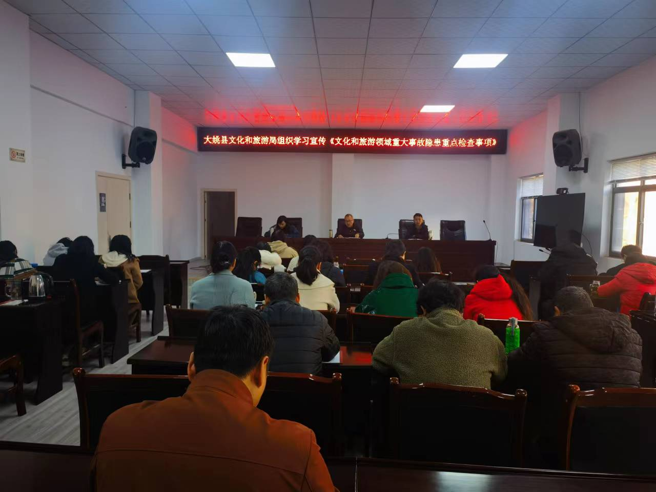 为深入学习宣传贯彻文化和旅游部办公厅印发的《文化和旅游领域重大事故隐患重点检查事项》和省、州关于开展文化和旅游领域重大事故隐患重点检查工作的相关要求,11月27日,大姚县文化和旅游局召开文化和旅游领域重大事故隐患重点检查培训工作会,会议由县文化和旅游局党组书记、局长武瑞林主持。