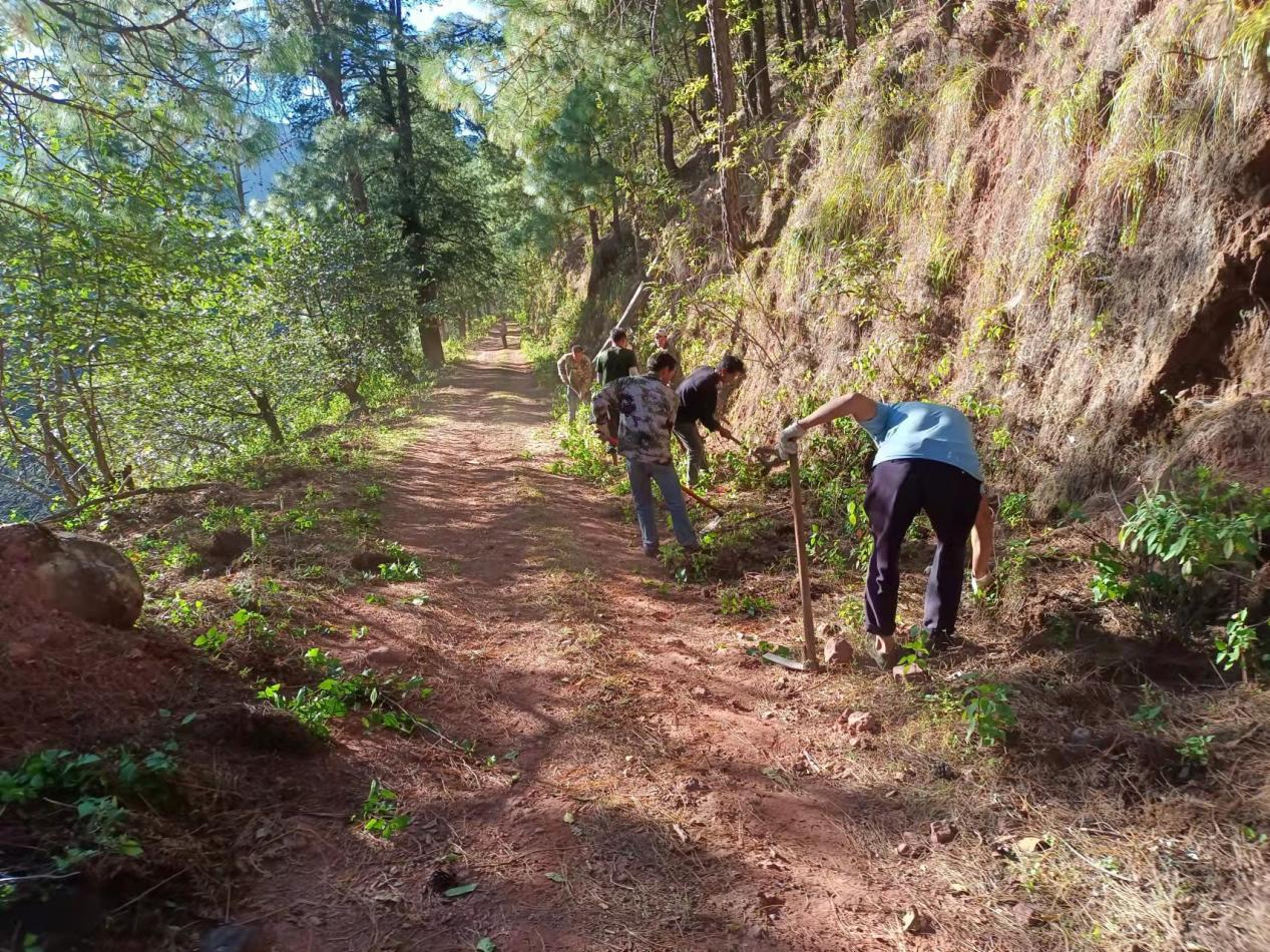 根据分场统一安排,全场干部职工亲身参与、结合党员五岗争创,组建党员突击队和护林员突击队利用锄头、砍刀等工具,采取人工清理方式,按照“能通则通、能清则清”的原则,逐片区进行拉网式清理,确保不遗漏任何死角。集中力量清理了道路沿线的杂草、枯枝落叶、少量塌方落石等。
