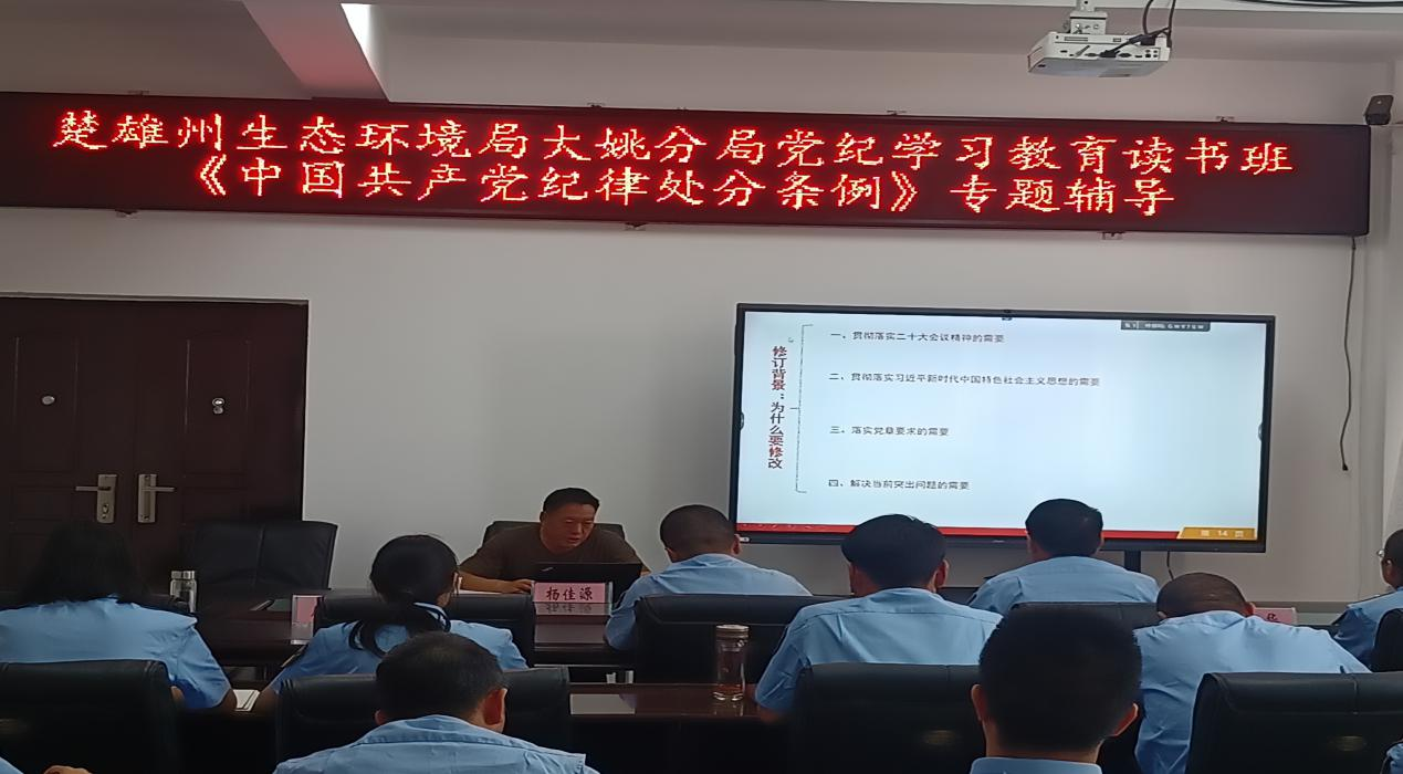 2024年5月10日,楚雄州生态环境局大姚分局举办党纪学习教育读书班学习《中国共产党纪律处分条例》专题辅导。县纪委监委驻林草局纪检组长杨佳源同志围绕新修订的《中国共产党纪律处分条例》(以下简称《条例》)作专题辅导报告,局党组书记局长文学江同志对读书班活动提出了具体要求,全局干部职工参加学习。