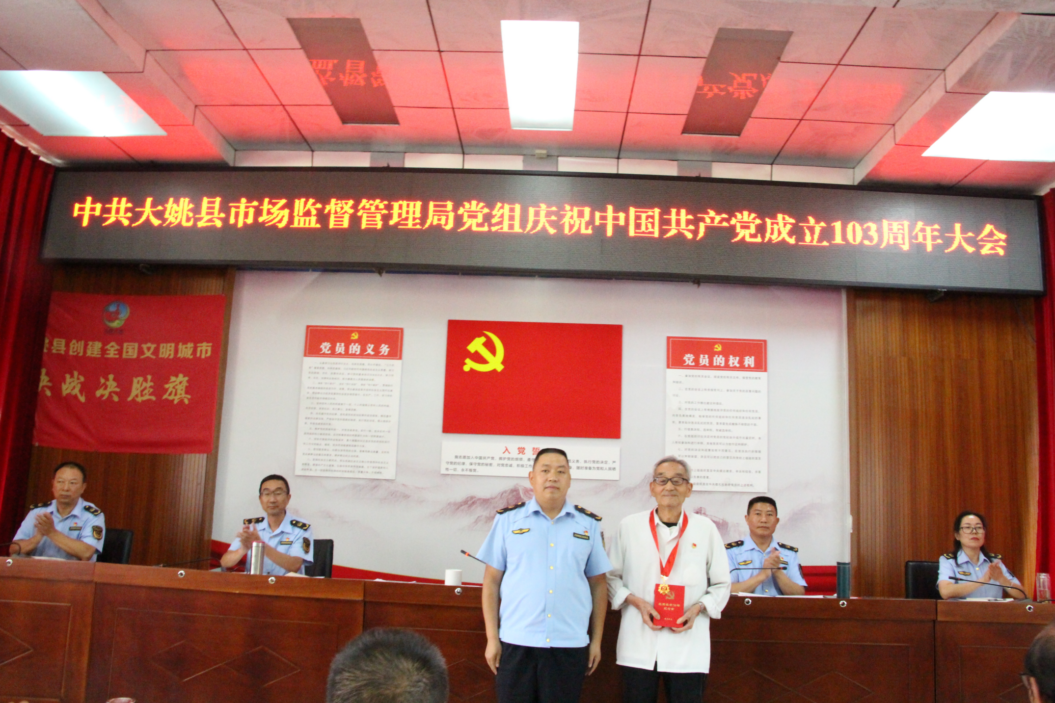 颁发奖章葆本色。向党龄达到50周年的退休老党员周琳同志颁发了“光荣在党50年”纪念章,向老党员致以敬意和祝福,并号召广大党员以他为榜样,初心如磐跟党走,始终不忘“来时的路”,为党旗增辉,继续为市场监管事业发展贡献力量。