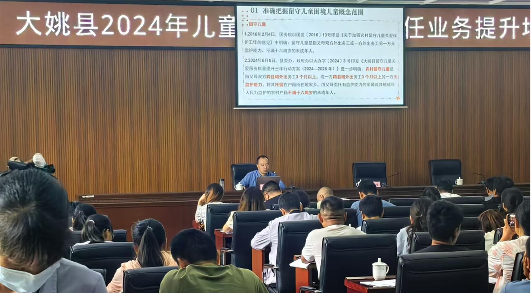 为深入学习贯彻习近平总书记关于儿童工作重要指示批示精神,加强基层儿童工作队伍建设,提高儿童督导员和儿童主任的业务能力和服务水平,稳步推进大姚县留守儿童关爱服务质量提升行动,切实保障儿童的合法权益,大姚县举办了2024年儿童督导员 儿童主任业务提升培训班。