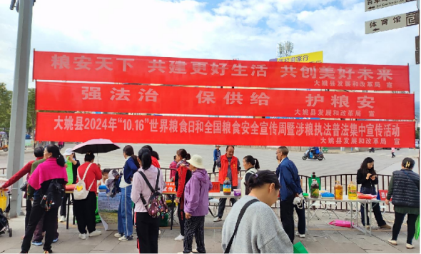 每年的10月16日是“世界粮食日”,“世界粮食日”所在的周是全国粮食安全宣传周。今年是中华人民共和国成立75周年,是实现“十四五”规划目标任务的关键一年。为全面贯彻党的二十大和二十届二中、三中全会精神,深入实施国家粮食安全战略和乡村振兴战略,健全粮食和食物节约长效机制,2024年10月16日上午,县发展改革局牵头县农业农村局、县教育体育局、县妇女联合会、县机关事务服务中心、县粮食储备有限公司在大姚县金碧镇永盛农贸市场外共同组织开展大姚县2024年世界粮食日和全国粮食安全宣传周暨涉粮执法普法集中宣传活动。