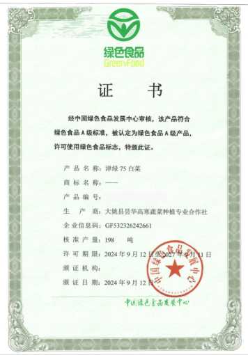 近日,以昙华白菜种植为主的大姚县昙华高寒蔬菜种植专业合作社所申报的秋绿75白菜、津绿75白菜2个蔬菜产品获中国绿色食品发展中心绿色食品认证。