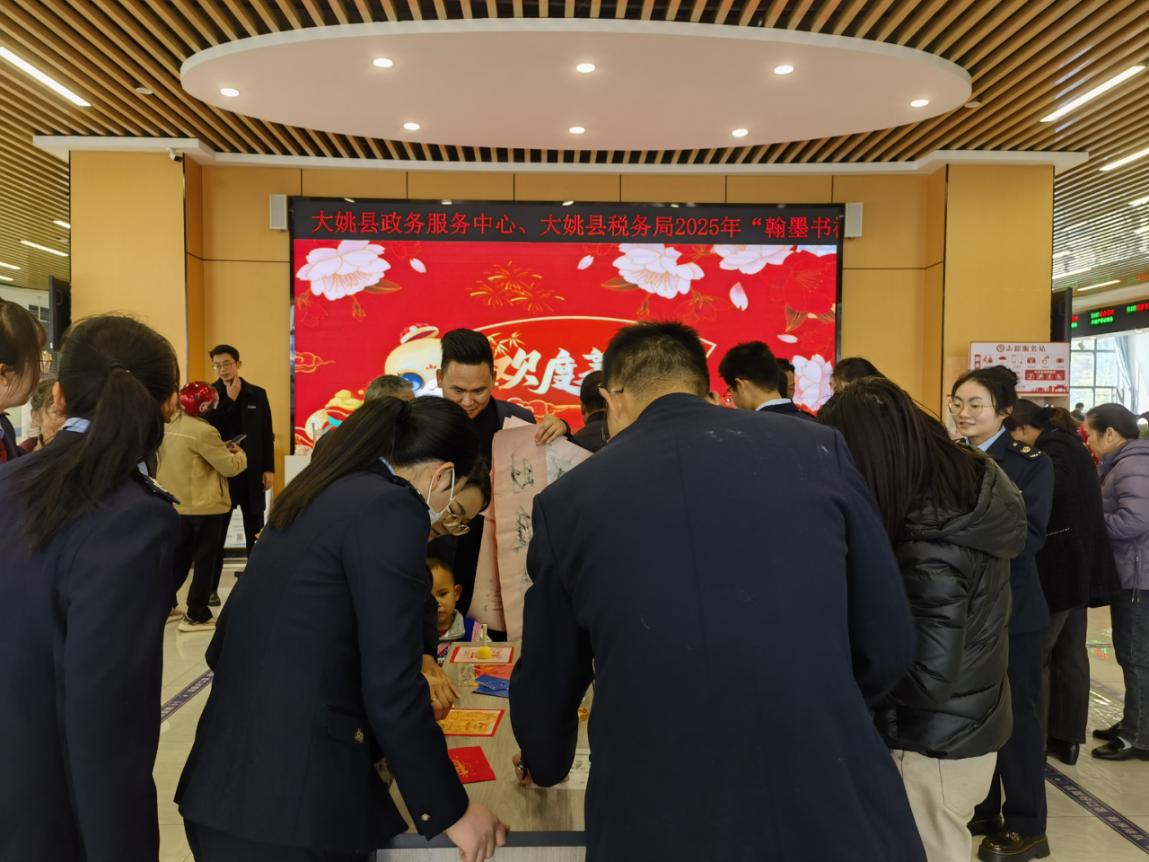 1月20日下午,大姚县政务服务中心和县税务局联合开展“翰墨书祥瑞,挥春送祝福”写春联送政策活动,用最具“年味儿”的方式,向前来办事的群众送上不一样的新春祝福。