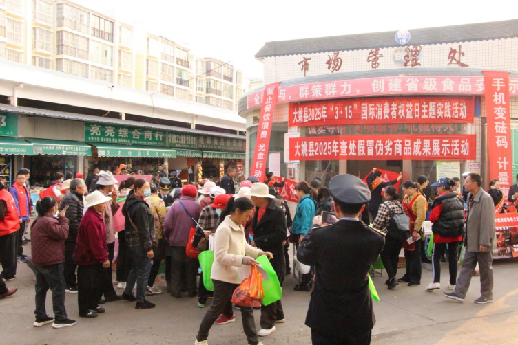 ——多部门联合宣传。2025年3月14日上午,大姚县市场监督管理局牵头县农业农村局、县文化和旅游局、县烟草专卖局、县金融监管局等县打击侵犯知识产权和制售假冒伪劣商品领导小组部分成员单位,在人员集中的永盛农贸市场集中开展宣传。通过悬挂宣传标语、展示宣传展板、发放宣传资料、解答群众咨询等各种形式,广泛宣传消费维权相关的法律法规,现场解答和受理消费者咨询、投诉,提升经营者的诚信经营意识和消费者维权意识。