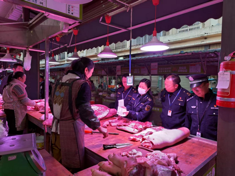 为全面落实食品安全领域推进群众身边具体实事工作要求,严厉打击肉类产品违法违规行为,全力守护人民群众“舌尖上的安全”,近日,大姚县市场监督管理局联合县公安局、县农业农村局开展联合执法检查,持续深化肉类产品质量安全专项治理。