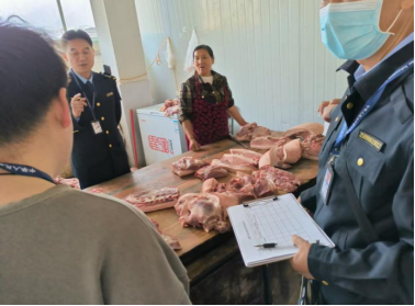 2025年4月9日,适逢六苴集市,大姚县农业农村局联合乡镇市管所,执法大队,出动人员6人,对肉制品经营进行突击检查,现场查验经营主体经营资质是否齐全,货品来源渠道是否正规,动物检疫合格证、肉品检疫合格证,是否票货相符。在六苴中仓农贸市场内对2户鲜肉销售户查证验证,现场告知群众,通过查看检疫证明,即可了解肉品屠宰信息,肉品来源,肉品是否合格,当场解决了群众关切的肉品安全问题。