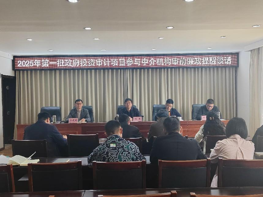 为深入贯彻落实全面从严治党要求,扎实开展深入贯彻中央八项规定精神学习教育,把“严”的主基调贯穿到我局政府投资审计全过程各方面,着力筑牢投资审计的“防腐墙”,有效防范中介机构参与政府投资审计带来的廉政风险,扎实推进大姚县政府投资审计工作。近日,大姚县审计局组织召开2025年第一批政府投资审计项目参与中介机构审前集体廉政提醒谈话会议。县审计局主要领导、分管领导、相关股室及3家中介机构参加会议。