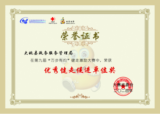 近日,大姚县政务服务管理局被“万步有约”健走激励大赛组委会授予“优秀健走促进单位奖”荣誉并颁发了证书。