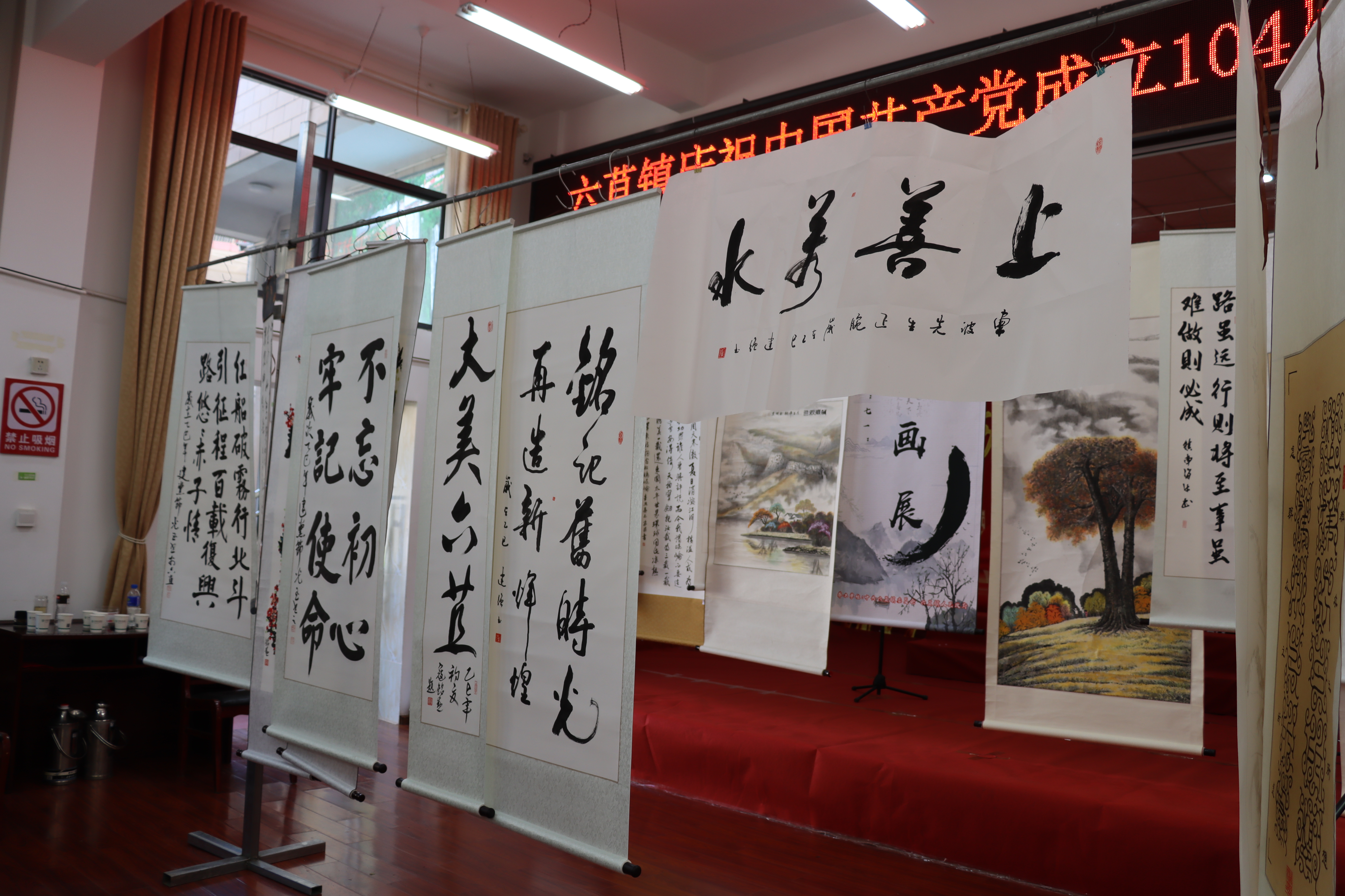 挥毫泼墨,举办一次书画活动。提笔、落笔……光影流转下,走笔宣纸上,纵横墨色间。7月1日下午,六苴镇举办“翰墨飘香颂党恩丹心溢彩庆‘七一’”书画会活动。镇村干部职工和书画爱好者们以笔传情、以画抒怀,一个个生动的故事,一幅幅构思独特,充满童心的作品跃然纸上。或笔走龙蛇书写“不忘初心、牢记使命”“清风扬正气,廉洁润人心”等脍炙名言,或行云流水堆叠一幅幅大好河山。每一幅作品都饱含着党员们对党的热爱,对美好生活的歌颂。