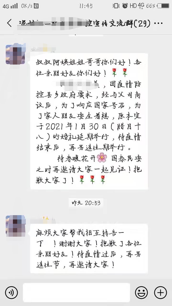 通过村组微信群、活动室小广播等宣传手段,广泛动员计划举行农村自办宴席的农户缓办宴席。充分发挥乡、村、组三级工作人员作用,入户开展实地劝访工作。市管所、乡食安办和村党总支工作人员先后三次到白某某户开展劝导缓办婚宴,功夫不负有心人,最终白某某户同意停办婚宴,即刻告知亲朋好友婚宴延期举行。