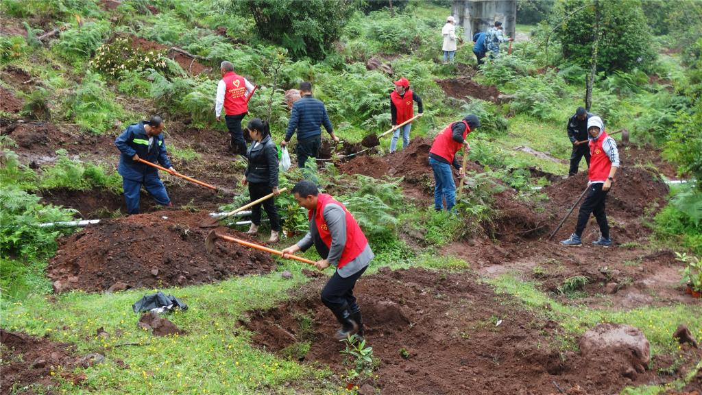 挥锹铲土、挖坑、栽苗、填土,在大姚县昙华乡的咪依鲁雕像旁,50余名昙华干部群众干劲十足,忙碌不停,正在开展义务植树活动。经过一上午的劳动,共栽下110余株马缨花树苗。