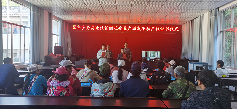 近年来,昙华乡把易地扶贫搬迁作为脱贫攻坚的头等大事和第一民生工程,分别将居住在偏远山区的124户贫困群众搬迁到了县城的“小康苑易地扶贫搬迁安置点”和分散安置到昙华乡各村小组进行安置,并高度重视搬迁群众的后续扶持和权益保护工作,在不断完善教育、医疗等相关配套设施和加强产业、就业扶持的同时,要求项目业主及各级各部门主动上门服务,收集好办证资料,免费为搬迁群众做好测绘、审图、报批等工作,加快办理搬迁群众不动产权登记证书。经多方共同努力,昙华乡首批62本不动产权证书于5月26日顺利发放到搬迁贫困户手中。