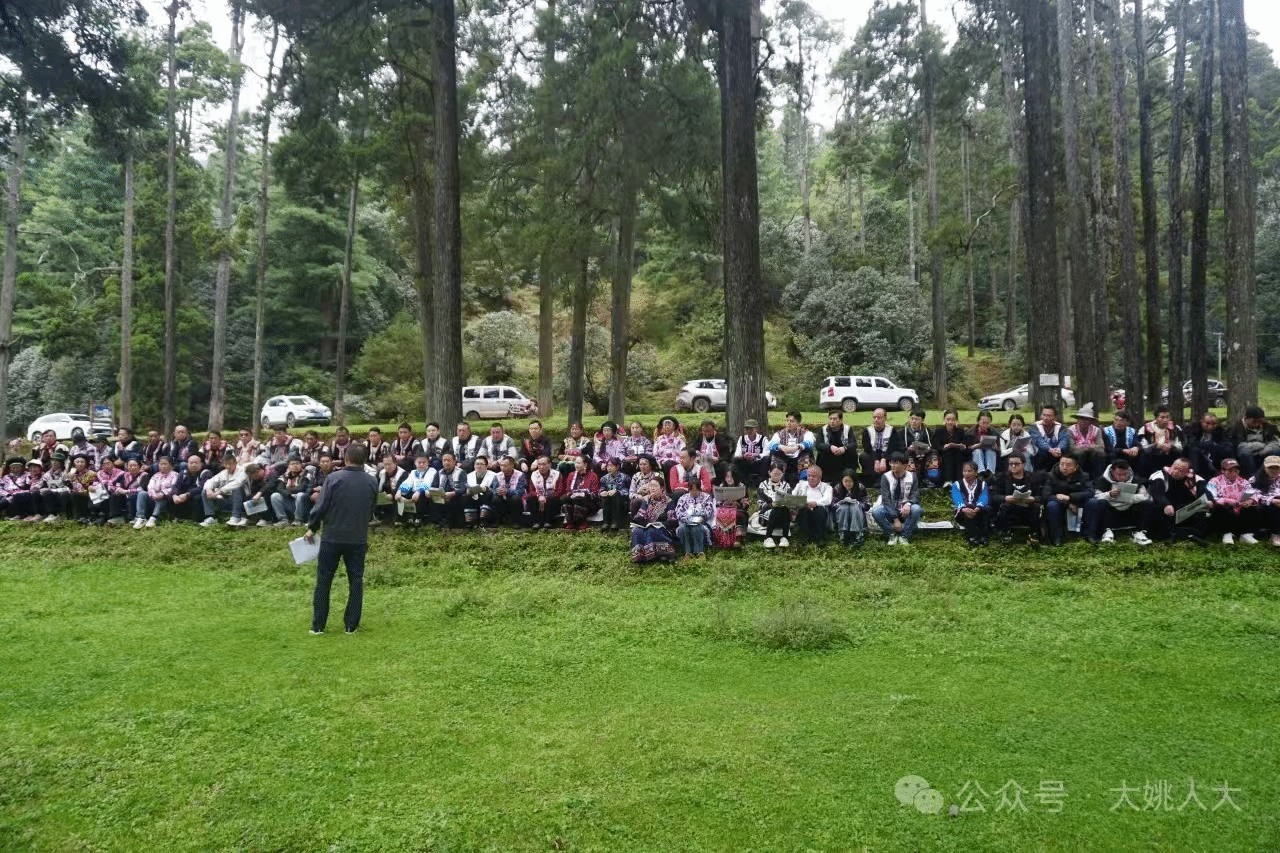 深秋初冬,午后的大姚县昙华乡千柏林笼罩在灰色的云层下,微风中已带着寒意。然而这片林子却因一群特殊学习者的到来显得格外温暖——州县乡三级人大代表和群众代表身着绚丽的民族服装,共同开展《习近平谈治国理政》第五卷和党的二十届四中全会精神专题学习。本次活动旨在深入学习领会习近平新时代中国特色社会主义思想最新成果,及时准确把握党中央决策部署,不断提升人大代表的政治理论素养,强化对人民群众的教育引导,推动党的创新理论在基层落地生根。