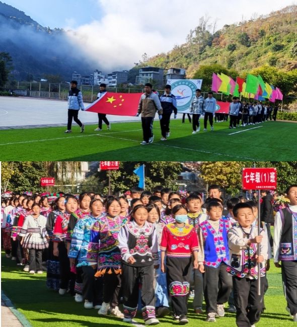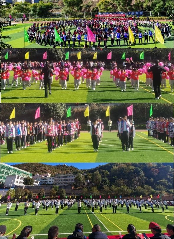 上午十时,激昂的运动员进行曲响起,开幕式正式启动。国旗护卫队步伐铿锵,校徽、校旗方阵庄严紧随。随后,花环队、鼓号队及各运动员代表队依次入场。同学们身着特色民族服饰,口号响亮,队列整齐,以饱满的精神走过主席台,展现出三岔河中学学子团结进取、多元竞发的精神风貌。