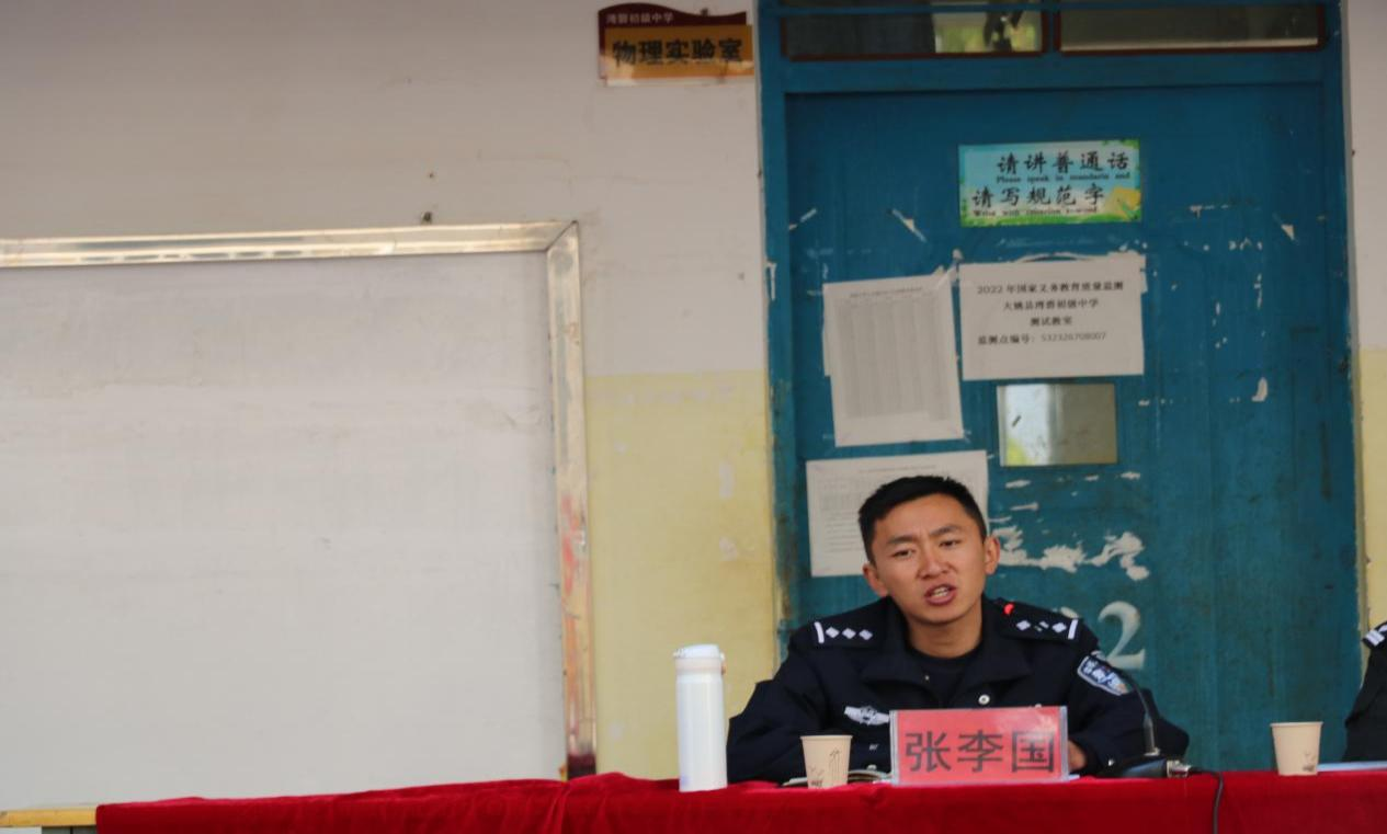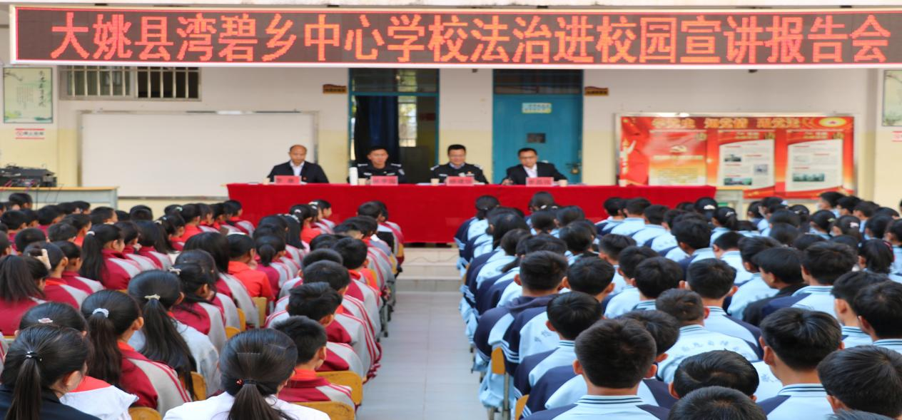 为认真贯彻落实中共大姚县委办公室、大姚县人民政府办公室印发的《大姚县2023年普法强基补短板专项行动实施方案》的通知的相关要求,切实打好“守护未来”普法攻坚战,2023年3月2日上午10时,大姚县公安局政委杨建华,湾碧乡人民政府副乡长、湾碧派出所所长张李国一行到湾碧乡中心学校,深入开展“法律进学校”活动。