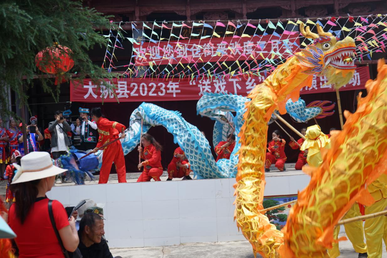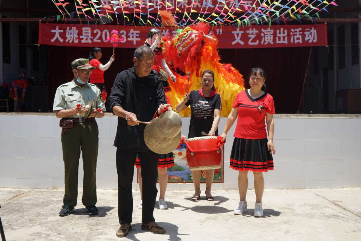 金碧镇人民政府联合大姚县文化馆负责出文艺节目,节目地点定在仓街老年活动中心。未时,只听闻,“舞龙来了”,仓街老年活动中心院子里锣鼓喧天,掌声四起,小小的院落挤满人。随着一个个接地气的花灯剧搬上舞台,一场场畅想二十大、歌唱新时代的歌舞表演让气氛随之活跃起来,观众仅存的一丝丝生分早已化为乌有,熟悉的“烟火气息”逐渐升温。