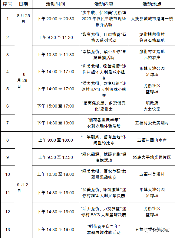 为深入贯彻落实党的二十大精神和习近平总书记系列重要讲话精神,进一步打造龙街镇“农业产业强镇、生态宜居乡镇、特色味稻小镇”品牌,充分展示龙街农村改革及产业发展取得的成绩,极大调动广大农民群众的积极性、主动性和创造性,提升广大农民群众的荣誉感、幸福感和获得感,龙街镇将于2023年8月25日-9月2日举办“庆丰收 促和美遇见楚雄·大姚龙街2023年农民丰收节”系列活动。