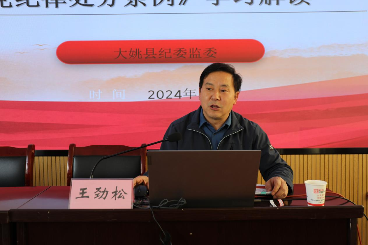 读书班邀请了大姚县纪委监委四级调研员王劲松同志作了“加强纪律建设 提供坚强保障”专题辅导,他围绕《中国共产党纪律处分条例》,从加强党的纪律建设的重要意义、《条例》修订的背景和意义、《条例》修订的主要内容、抓好《条例》的贯彻执行四个方面,采取以案说纪、以案说法、以案说责的方式进行专题解读,帮助党员干部深刻理解《条例》的核心要义和规定要求,引导大家将学习教育的成果转化为筑牢思想防线的纪律行动,转化为担当作为的硬脊梁、铁肩膀、真本事,更好地担负起职责使命。