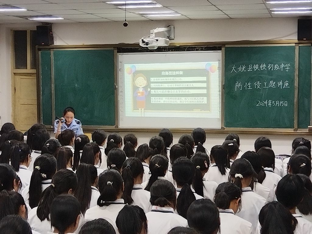为了切实增强女生的安全防范意识,学会辨别性侵害行为,提高性侵害应对能力,5月15日大姚县公安局铁锁派出所所长、大姚县铁锁初级中学法治副校长王守康同志一行到校开展了“预防性侵,守护成长”为主题的教育活动。我校127名女生和女教师参与了活动。