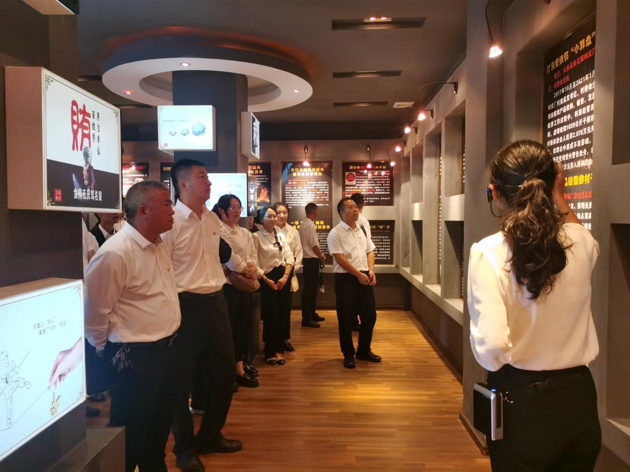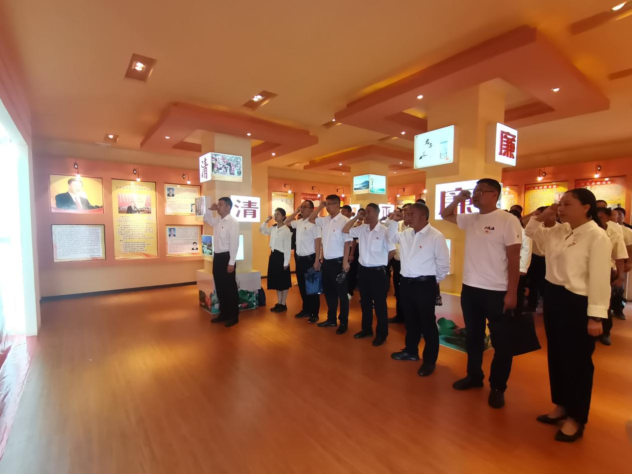 在县廉洁文化中心警示教育基地,大家跟随着讲解员的步伐,依次参观展厅,通过观看警示教育短片、聆听讲解、观摩图文展板、读典型案例等形式,深刻剖析了违纪违法人员从理想信念的坍塌到堕落蜕变的人生轨迹。一个个鲜活的事实,一张张忏悔书,给大家带来了强烈震撼,让全体党员干部感受到“一念之差”到“一墙之隔”的巨大冲击。在深刻触动后,党员干部们进行了一场庄严的宣誓,大家紧握拳头,目光坚定,用铿锵有力的声音重申了对党的忠诚。