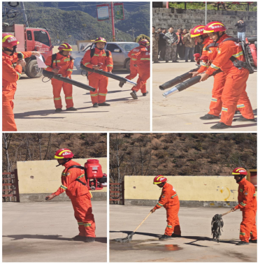 演练中应急救援队员运用风力灭火机、动力水枪、电动细水雾灭火机、扑火拖把等灭火器具,在现场指挥员的指挥下按照森林火灾班组灭火战术对各种火情快速、安全、有序地进行了模拟扑救。