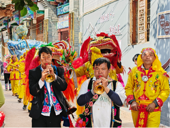 清晨,古镇在爆竹声与锣鼓声中苏醒。两条长达数十米的彩龙依次从南关外翻腾至西关外,舞龙者身着传统黄衣红绸,龙身蜿蜒起伏,龙首威严灵动,他们手持彩龙,步伐矫健,将“游龙”“钻龙身”等动作演绎得行云流水。两支由石羊社区、岔河村组成的队伍,以刚劲舞姿祈求风调雨顺、仓廪丰实,龙目所至,尽是百姓对美好年景的殷殷期盼。舞龙队伍穿梭于青砖素瓦的古镇街巷,时而腾跃翻飞,时而盘桓低舞,与人群的欢呼声、爆竹的脆响交织成一片欢腾的海洋。与此同时,孔子文化广场上,多支村级文艺队、老年协会队轮番登台,彝族左脚舞、彝族小调演唱等节目接连上演,舞步欢快、歌声悠扬,游客与本地居民手挽手加入舞蹈,共绘民族团结的生动图景。