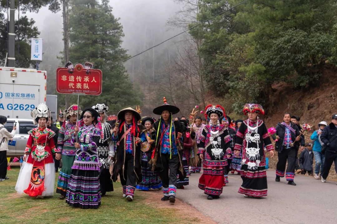 非遗巡游队伍沿山道蜿蜒成一条流动的文化血脉,它以绚丽多姿的形式,为插花节注入了更为浓郁的节日气息,瞬间点燃了现场的热烈氛围。这场穿行于山间的活态展演,不仅以“行走的非遗课堂”之名激活了昙华乡的节庆基因,更通过绣娘指尖的彝纹图腾、毕摩吟诵的古老梅葛,为八方来客揭开“世界级特色节庆”的神秘面纱。