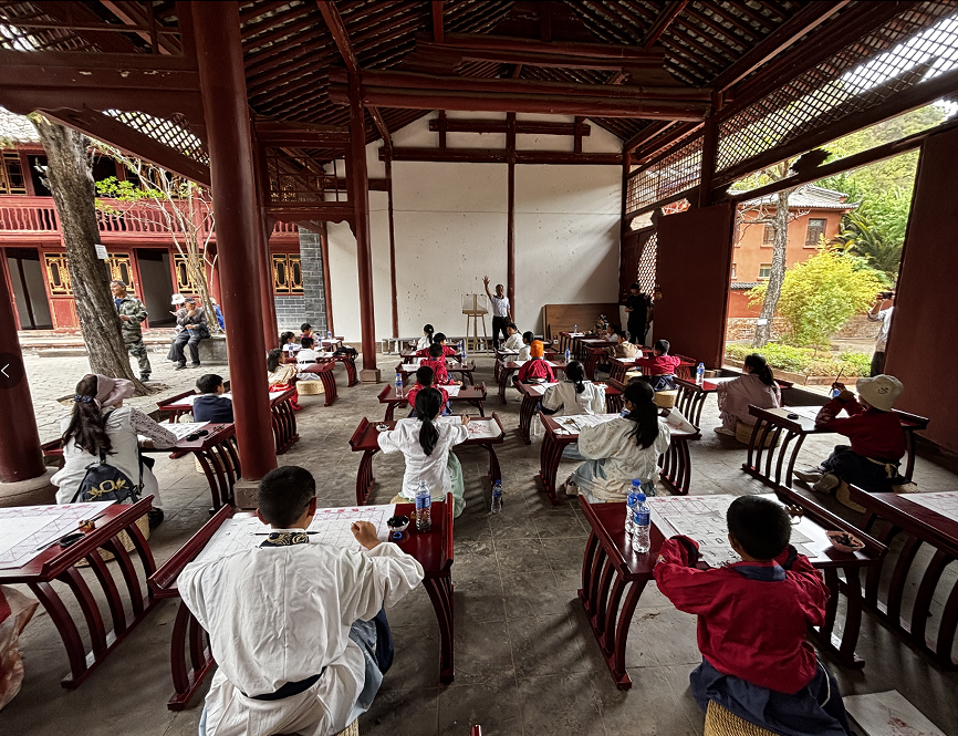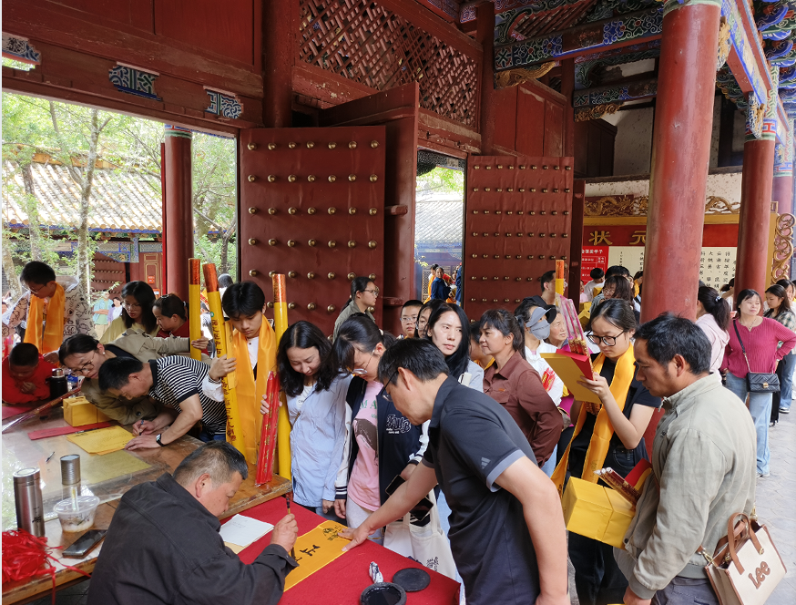 “一拜自强不息,二拜厚德载物!”5月1日上午,来自昆明、楚雄、攀枝花等地的300余名传统文化爱好者齐聚大成殿,通过献帛、献爵、恭读祭文等传统礼仪,感悟儒家文化精髓。身着汉服的研学团队穿梭于棂星门、朱子阁间,在“滇中儒学活化石”的浸润中完成文化寻根之旅。“孩子把‘状元及第’拓片装裱带回家,这是最好的成长礼物”。攀枝花游客周女士展示着特别定制的金榜题名卷轴。