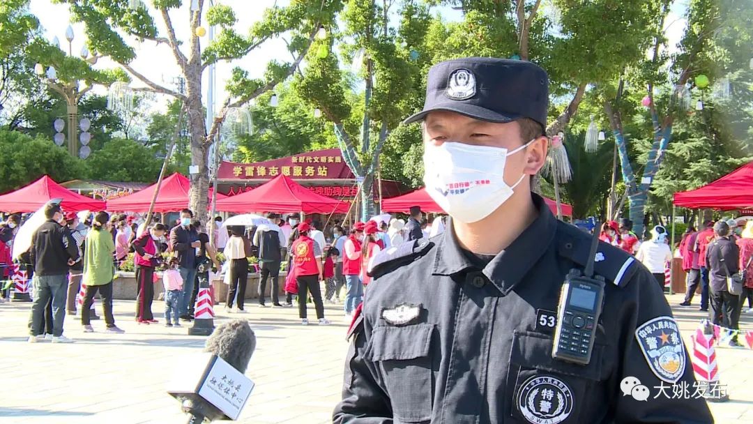 大姚县公安局特警大队志愿者熊兴超说:“国庆期间,大姚县公安局全体民警辅警在岗在位,今天到蜻蛉湖广场核酸采集点维护现场秩序,如果现场有人民群众需要帮助时,我们会及时伸出援手。”